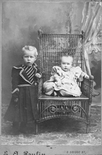 Description :DEUX ENFANTS AGES D'CA 2 ANS ET 6 MOIS. LEONIDAS EST DEBOUT AU COTE DE SA SOEUR ASSISE SUR UNE CHAISE EN ROTIN.