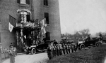 Description :ON VOIT UNE PARTIE DE LA FACADE DE L'HOSPICE, DECOREE AVEC DES DRAPEAUX. DES AUTOMOBILES SONT STATIONNEES A L'AVANT ET DANS L'UNE D'ELLES, ON PEUT RECONNAITRE MGR LAROCQUE (DE LOIN). DES ENFANTS (ORPHELINS) HABILLES EN ZOUAVES FORMENT UNE HAI...