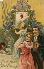 Description :UN HOMME ET UNE FEMME SE TIENNENT DEBOUT ALORS QU'UN JEUNE ENFANT DECOUVRE, SUR LE CALENDRIER, LA DATE DU Ier JANVIER. SUR L'HORLOGE IL APPROCHE MINUIT.