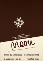 Description :AFFICHE PUBLICITAIRE ANNONCANT LA TENUE D'UNE EXPOSITION DU REGROUPEMENT DES ARTISTES DES CANTONS DE L'EST INTITULEE "VISOU". ELLE AVAIT LIEU A LA LA SOCIETE D'HISTOIRE DE SHERBROOKE AU DOMAINE HOWARD (MUSEE DU PATRIMOINE).