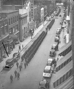Description :VUE SUR LA RUE WELLINGTON NORD. UN DEFILE MILITAIRE TRAVERSE LA RUE DU NORD VERS LA RUE KING. ON VOIT BIEN QUELQUES EDIFICES SUR LE COTE OUEST: CANADIAN NATIONAL TELEGRAPH, LE THEATRE GRANADA, LE COMMERCE DE PIANOS WILSON.