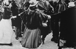 Description :UNE FOULE DE GENS CHAUDEMENT HABILLE DANSE UNE FARANDOLE LORS D'UN CARNAVAL D'HIVER NON IDENTIFIE.