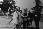 Description :UN GROUPE DE 7 PERSONNES, RAQUETTES EN MAIN, SE TIENNENT DEVANT UN FILET SUR LE TERRAIN. DEUX PRETRES SONT EN LEUR COMPAGNIE.
