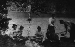 Description :UN GROUPE DE 7 PERSONNES ENDIMANCHEES TIENNENT UN PIQUE-NIQUE AUX ABORDS D'UNE RIVIERE NON-LOCALISEE. A GAUCHE, UNE MARMITTE CHAUFFE SUR UN FEU DE BOIS.
