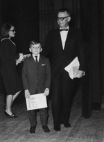 Description :FRANCOIS FORTIER, EN COMPAGNIE D'UN DES JURY DU FESTIVAL DE MUSIQUE DU QUEBEC POUR 1966, RECOIT UN 1er PRIX DANS SA CATEGORIE. AGE D'ENVIRON 9 ANS, IL EST ORIGINAIRE DE LAC MEGANTIC.