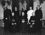 Description :VUE SUR UN GROUPE D'ECCLESIASTIQUES, PROBABLEMENT AU GRAND SEMINAIRE. AU CENTRE, MGR CASSULO ET MGR GAGNON. (POUR IDENTIFICATION, VOIR PHOTOCOPIE).