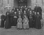 Description :PHOTOGRAPHIE DE GROUPE LORS DE L'EVENEMENT. IL Y A QUELQUES LAICS MAIS IL S'AGIT SURTOUT D'ECCLESIASTIQUES. A L'AVANT-PLAN, ON RECONNAIT MGR PAUL LAROCQUE ET MGR A. O. GAGNON. AUTRES RELIGIEUX PRESENTS: A. EMMANUEL DESCHAMPS, MGR OVIDE CHARLEB...