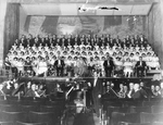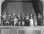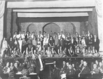Description :VUE SUR LA SCENES ET L'ORCHESTRE. LES COMEDIENS COSTUMES ET MAQUILLES POSENT EN COMPAGNIE DES MUSICIENS DE L'UNION MUSICALE DE SHERBROOKE AU THEATRE "HIS MAJESTY" LORS DE LA REPRESENTATION DE CARMEN.