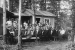 Description :A L'EXTERIEUR, DEVANT UN PETIT CHALET, LES FAMILLES BOIVIN ET DESMEULES CELEBRENT AUTOUR D'UNE TABLE.