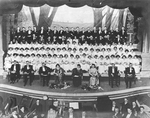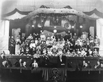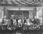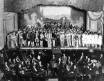 Description :VUE SUR LA SCENE ET L'ORCHESTRE DU THEATRE "HIS MAJESTY". LES COMEDIENS COSTUMES ET MAQUILLES POSENT EN COMPAGNIE DES MUSICIENS DE L'UNION MUSICALE DE SHERBROOKE LORS DE LA REPRESENTATION DE L'OPERA "LA DERNIERE VALSE".
