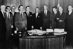 Description :ASSEMBLES AUTOUR DU BUREAU DU MAIRE. NOUS POUVONS RECONNAITRE EVERETT NICOL, HENRI BAUDOT, J.F.GAUTHIER, DR E.T.ROPE (CONSUL AMERICAIN A MONTREAL), JOHN DALY, ARMAND NADEAU, JULES WAYNE, J.PAUL GERVAIS, ROBERT BELISLE ET J.C.L.PILON.