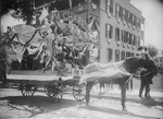 Description :A L'OCCASION D'UNE PARADE, UN CHAR ALLEGORIQUE DECORE DE DRAPEAUX AMERICAINS AFFICHE UN GRAND TITRE: "M.CHAREST". LE CONDUCTEUR DE LA VOITURE A CHEVAL EST ACCOMPAGNE DE 3 ENFANTS. L'ENDROIT EST NON-LOCALISE.