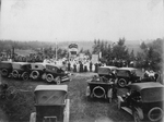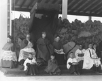 Description :DEVANT LE CHALET DU PARC, UNE FOULE EST ASSEMBLEE (JEUNES FILLES). PARMI LES DIGNITAIRES ASSIS DEVANT, NOUS POUVONS RECONNAITRE WENCESLAS GENEST ET (AVEC RESERVES) MGR DESRANLEAU. DORIMENE BOURQUE EST LA PERSONNE AVEC LE GRAND CHAPEAU.