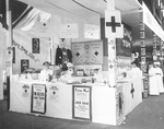 Description :UN KIOSQUE DE LA CROIX ROUGE LORS DE LA PREMIERE GUERRE MONDIALE. DES FEMMES FONT DU TRICOT. DIFFERENTS PRODUITS SONT MONTRES ET DES AFFICHES DIVERSES INCITENT A DES DONS OU A L'ENROLEMENT. A COTE, UN KIOSQUE DE LA KELLY TIRE CO. ET DE L'AUTRE...
