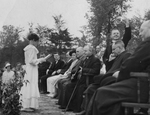 Description :DIVERSES PERSONNES SONT ASSISES A L'EXTERIEUR. UNE JEUNE FILLE LEUR FAIT FACE ET LIT UNE ADRESSE (GISELE VANIER). ON RECONNAIT DE GAUCHE A DROITE, BLANCHE ALICE JAVEST, ORIGENE VEL, ARMAND CORRIVEAU, NON-IDENTIFIE, MARTHE RIOUX, EMILE RIOUX, C...