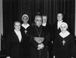 Description :MGR CABANA ENTOURE DE 5 RELIGIEUSES DES PETITES SOEURS DE STE-FAMILLE QUI S'OCCUPE DE L'ENTRETIEN DE L'ARCHEVECHE