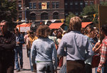 Description :DE NOMBREUX FESTIVALIERS CIRCULENT. AU CENTRE IL Y A TROIS KIOSQUES D'ARTISANS. A L'ARRIERE-PLAN, SUR LA FACADE DU SEMINAIRE ST-CHARLES, ON VOIT UN PANNEAU REPRESENTANT LE COQ-GIROUETTE.