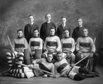 Description :UNE EQUIPE DE HOCKEY EN 1921-22 POSANT AVEC LEURS EQUIPEMENT (7 JOUEURS). DEBOUT A L'ARRIERE-PLAN, 2 PRETRES ET 2 GARCONS. PEUT-ETRE DES ETUDIANTS DU SEMINAIRE ST-CHARLES BORROMEE