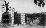 Description :DU MONUMENT AUX MORTS (CONSTRUIT EN 1926), VUE SUR LA RUE KING OUEST VERS L'EST. BEAUCOUP DE CIRCULATION SUR LA RUE KING. AU LOIN, ON VOIT L'HOPITAL ST-VINCENT DE PAUL.