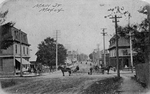 Description :VUE SUR LA RUE MAIN A MAGOG. ON VOIT DES GENS EN CALECHE, A BICYCLETTE.