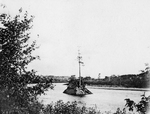 Description :VUE SUR LE ROCHER DU PIN SOLITAIRE AU MILIEU DE LA RIVIERE ST-FRANCOIS A SHERBROOKE.