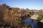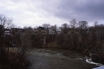 Description :VUE SUR UNE PARTIE DE LA RIVIERE MAGOG A PARTIR DU PONT CABANA A SHERBROOKE. SUR L'ELEVATION DE TERRAIN UNE RANGEE DE MAISON DE STYLE BOITE CARREE.