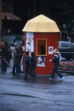 Description :VETU D'IMPERMEABLES DEUX PERSONNES S'ADRESSENT A UNE JEUNE FILLE ASSISE DANS UN SILO ROUGE, SITUE SOIT COIN BROOKS-KING OU COIN MARQUETTE-CATHEDRALE.