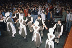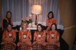 Description :27.1 : SIX JEUNES FEMMES, LES HOTESSES DE LA SOIREE, HABILLEES DU COSTUME OFFICIEL: T-SHIRT ORANGE, JUPE QUADRILLEE, TABLIER ORANGE ET LE MACARON. QUATRE JEUNES FEMMES PORTENT AUSSI LE FOULARD AUTOUR DU COU. - 27.2 : LOUIS BILODEAU REMET UNE E...
