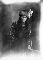 Description :PORTRAIT D'UNE FEMME, VETUE D'UN MANTEAU DE FOURRURE COIFFEE D'UN CHAPEAU A LARGE REVERS DE LAINE (?) ET A GRANDE BOUCLE.
