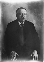 Description :PORTRAIT D'UN VIEIL HOMME MOUSTACHU, ASSIS, MAINS SUR LES CUISSES.