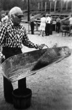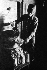 Description :UN HOMME TRANSVIDE LE SIROP D'ERABLE DANS DES CONTENANTS DE METAL.