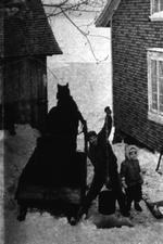 Description :SCENE D'UN HOMME QUI PUISE L'EAU SOUS LA GLACE. A SES COTES, SON CHEVAL ATTELE A UNE VOITURE ATTEND PATIEMMENT. A PROXIMITE, UNE RESIDENCE (NON-LOCALISEE) ET UN ENFANT.