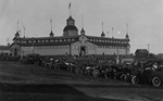 Description :VUE SUR LE TERRAIN DE L'EXPOSITION, LE BATIMENT UTILISE POUR LES EXPOSITIONS ET L'AIRE DE STATIONNEMENT AVEC DES VOITURES DE L'EPOQUE.