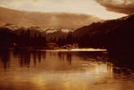 Description :VUE D'UN LAC, DE QUELQUES BATISSES SUR LA COTE ET DES MONTAGNES ROCHEUSES