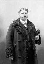 Description :DEBOUT, APPUYE A UNE CLOTURE DE BOIS, JOSEPH FONTAINE PORTE MANTEAU ET CHAPEAU A LA MAIN. A L'ARRIERE, DECOR EN TROMPE L'OEIL D'UN PAYSAGE.
