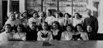 Description :UN GROUPE DE JEUNES FILLES DU MONT NOTRE-DAME SONT PHOTOGRAPHIEES DANS UNE CLASSE DE CHIMIE EN COMPAGNIE DE L'ABBE PIERRE-ACHILLE BEGIN.