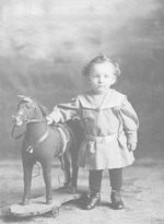Description :LONIA LACHARITE AGE D'ENVIRON 3 ANS DEBOUT AUX COTES DE SON CHEVAL DE BOIS.