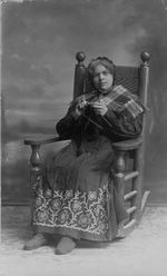 Description :UNE FEMME NON IDENTIFIEE, ASSISE DANS UNE CHAISE BERCANTE ET TRICOTANT UNE CHAUSSETTE AVEC 4 AIGUILLE A TRICOTER. ELLE EST VETUE D'UN CHALE A CARREAUX, D'UN LONG TABLIER FLEURI, D'UN BONNET ET D'UNE ROBE LONGUE.
