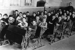 Description :DES GARCONS DU COURS PRIMAIRE SONT ASSIS BIEN SAGEMENT A LEUR PUPITRE. A L'ARRIERE, SE TIENT LEUR PROFESSEUR, UN FRERE DU SACRE-COEUR. ECOLE NON-LOCALISE.
