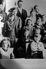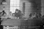 Description :UN PROFESSEUR SE PENCHE SUR SES ELEVES DU COURS PRIMAIRE QUI SONT AFFAIRES A LEUR PUPITRE. IL SEMBLE QUE LA SCENE SE PASSE DANS UNE ECOLE DE RANG.