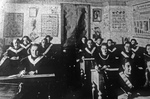 Description :VUE SUR UNE CLASSE DE JEUNES FILLES DU COURS SECONDAIRE EN COSTUME SCOLAIRE. IL EST POSSIBLE QU'IL S'AGISSE D'UNE CLASSE DU MONT NOTRE-DAME.