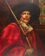 Description :REPRODUCTION D'UNE HUILE SUR TOILE D'UN PERSONNAGE FRANCAIS DU XVIIe SIECLE PORTANT CHAPEAU A LARGE BORD ET ARME D'UN LONG MOUSQUET.
