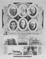 Description :6 RELIGIEUX DU DIOCESE DE SHERBROOKE QUI ONT CONTRIBUE A L'ERECTION DE LA PAROISSE STE-MARGUERITE-MARIE FONDEE EN 1921. 2 PRISES DE VUE SUR LA 1ere EGLISE, 1 SUR LE PRESBYTERE ET 1 SUR L'ECOLE.