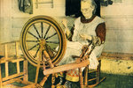 Description :UNE DAME AGEE FILE LA LAINE A SON ROUET. A GAUCHE, UN DEVIDOIR. 1.1: UNE FILEUSE DU QUEBEC, 1.2: UNE FILEUSE A UPPER CANADA VILLAGE.