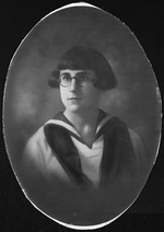 Description :PORTRAIT D'UNE JEUNE FILLE NON-IDENTIFIEE AVEC LUNETTES RONDES ET ROBE MATELOT.