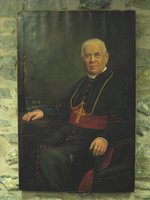 Description :PORTRAIT DE MGR OZIAS GAGNON, ASSIS. SOUTANE NOIRE AVEC CEINTURON ROUGE.