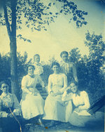 Description :GROUPE DE SIX JEUNES FEMMES NON IDENTIFIEES, ASSISES DANS UN PARC BOISE.