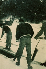 Description :3 HOMMES TAILLENT DES BLOCS DE GLACE SUR UNE SURFACE D'EAU A L'AIDE DE SCIE A GLACE.