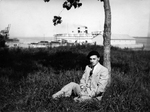 Description :L'HOMME PORTE UN BERET ET A UNE CIGARETTE A LA MAIN. IL EST ASSIS PAR TERRE, APPUYE A UN ARBRE. A L'ARRIERE-PLAN, ON APERCOIT UN PORT; DEUX PAQUEBOTS SONT ATTACHES AU PORT.