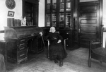 Description :REVEREND PERE LECOMBRE ASSIS DANS UNE PIECE SEMBLANT ETRE UNE BIBLIOTHEQUE. ON APERCOIT PRES DE LUI UN SECRETAIRE ET IL Y A BEAUCOUP DE LIVRE DANS LA PIECE.